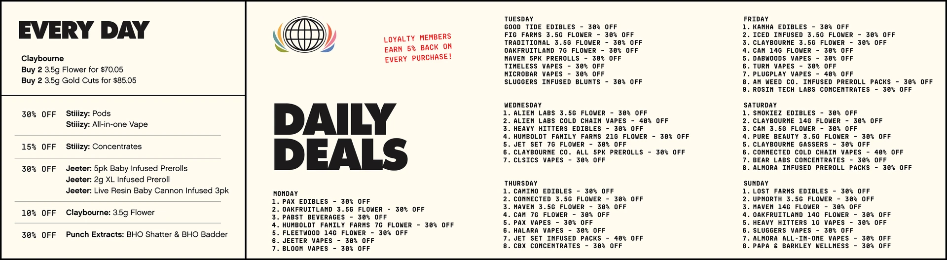 Weekly Schedule: Monday Edibles, Tuesday Vapes, Wednesday 3.5g Flower, Thursday Dabs, Friday Infused Prerolls, Saturday All Products, Sunday Vapes. Special offer: Every Friday $60 Getaway Bag Drop while supplies last.